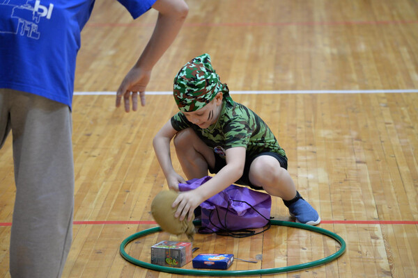 Далее участников ждали более активные испытания. Самым метким в конкурсе «Меткий стрелок» оказалась команда «Защитники России» из детского сада № 5 «Брусничка». В конкурс «Осенний караул» участникам нужно было проползти под сеткой, обойти кегли, добежать до пилотки, надеть ее и громко крикнуть: «Служу России!». Здесь отличилась команда «Голубые береты» из МКОУ «НОШ г. Бодайбо». Скорость и слаженность требовались от участников в конкурсе «Полевая кухня»: добежать до обруча, взять один предмет из «пайка» (вещмешок, тушенка, фляжка, гречка, кружка и др.) и вернуться в команду. Победу одержали «Бравые моряки» из детского сада № 1 «Золотой ключик», собравшие весь «паёк» быстрее всех. Испытание «Шифровка» проверило интеллектуальные способности участников. Настоящую семейную слаженность продемонстрировала команда, где дети выполняли свое задание, а родители тем временем ломали голову над секретным кодом. Команды «Спецназ» детского сада № 32 «Сказка» и команда «Защитники России» из детского сада № 5 «Брусничка» показали прекрасные способности к логическому мышлению и слаженную командную работу. Заключительный конкурс – «Полоса препятствий» стал настоящим экзаменом на ловкость, силу и взаимопомощь. Участникам нужно было проползти по скамейке, пройти змейкой между стойками, «минировать» и «разминировать» мешочки, оббежать стойку и вернуться. «Бравые моряки» из детского сада № 1 «Золотой ключик» оказались быстрее всех.